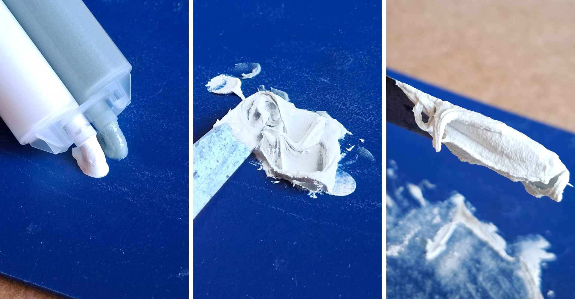 To mix PC-11® you’ll need a spatula, lolly stick or similar and probably a piece of scrap wood, cardboard or similar to mix on. We don’t recommend mixing in a cup or container as it can be hard to judge the % of parts. If the repair is outside and the weather is cool we’d recommend placing the tubs/syringe somewhere warm to reduce the viscosity.